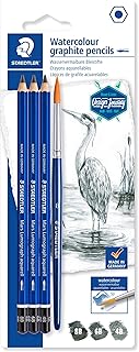 Staedtler Mars Lumograph Aquarell, Crayons graphites aquarellables, Utilisables à sec ou à l'eau, Étui blister avec 3 crayons aquarellables assortis et 1 pinceau, 100A SBK4
