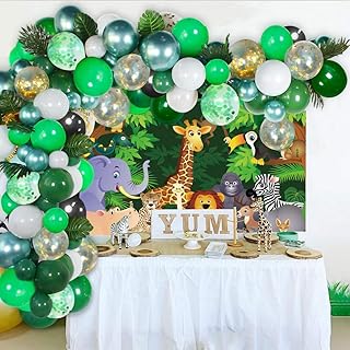 Jungle Décorations Ballon Guirlande & Arch Kit, Affiche de d'anniversaire en Tissu de Fête Jungle, Jungle Forêt Thème Ballon, Ballons Vert et Confettis Dorés avec Feuilles de Palmier